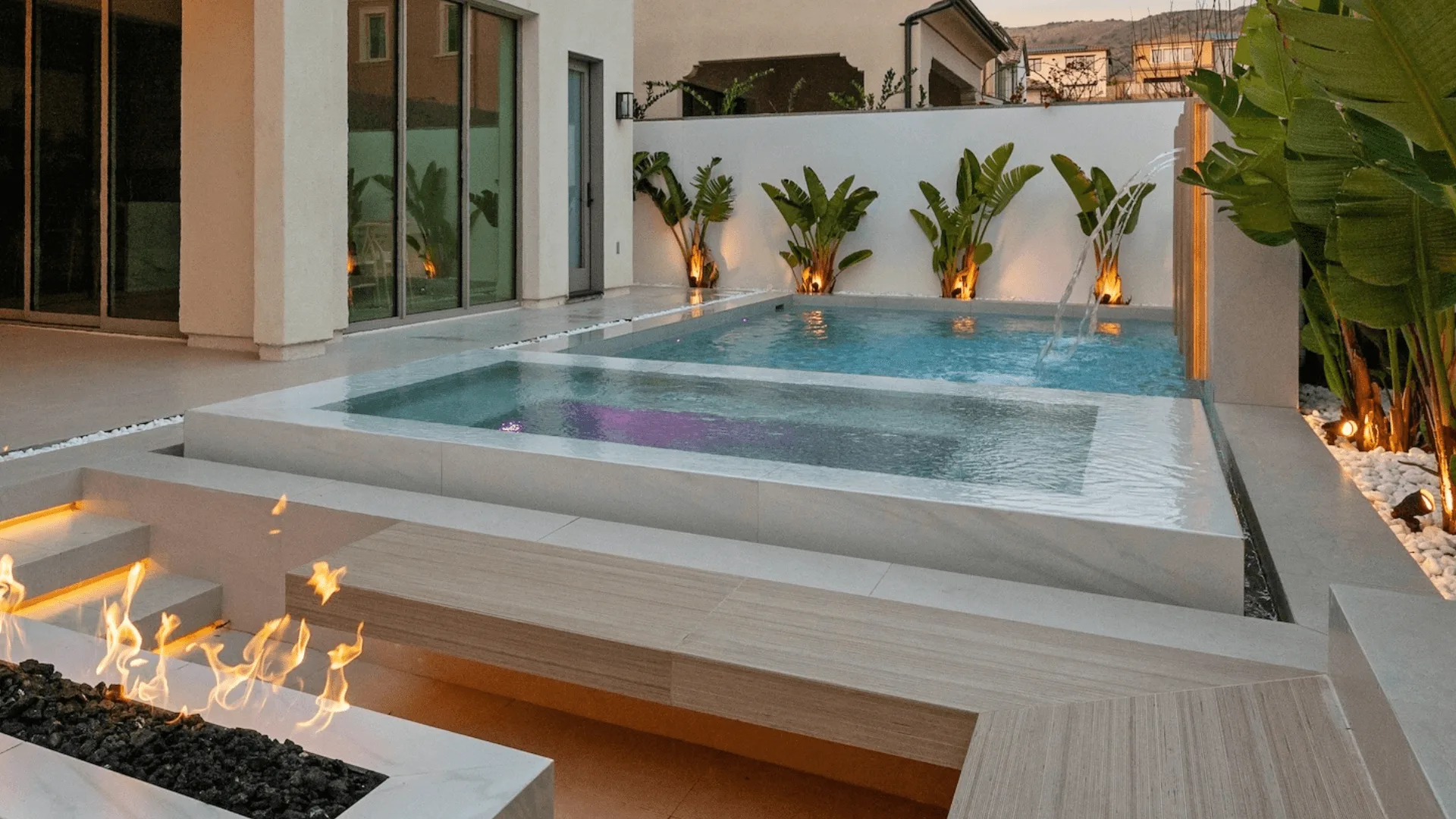 fiberglass swimming pool with a modern design featuring a water feature and surrounding landscaping with plants and lighting